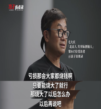 但在当时的环境下,这却根本不算事。在访谈中,毛大庆说:“亏损?那会大家都烧钱啊,只要能烧大了就行。那烧大了以后怎么办?以后再说吧!”
